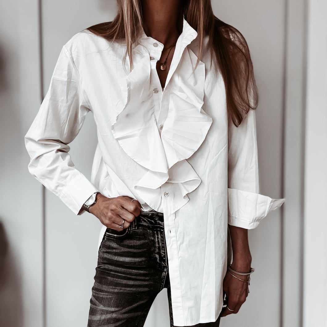 A super stylish blouse in with a gorgeous statement ruffle! Hangs beautifully. Wear tucked in or out. Perfect with jeans or joggers for spring & summer, and holidays!
