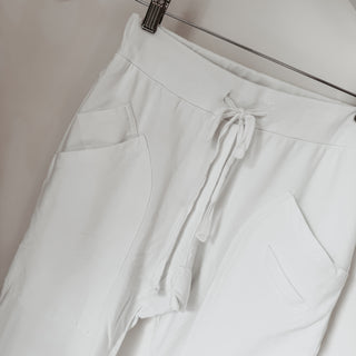 A super stylish and comfy jogger jeans with funky diagonal Pockets and an elastic tie waist.