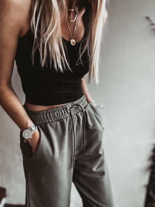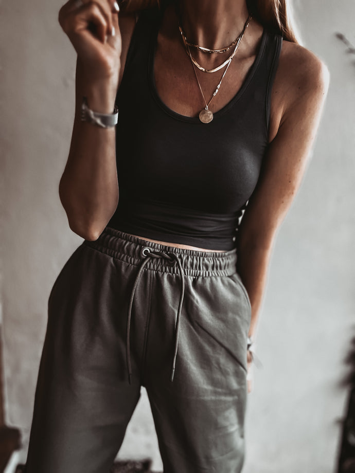 Particularly fab with high waisted bottoms, I love to wear mine with my ultimate joggers or super slouchy joggers pulled up high on my waist. These crop tops are great layered up together too! Love the white under this black one. These come up quite small so size up if not sure. I am wearing medium here.